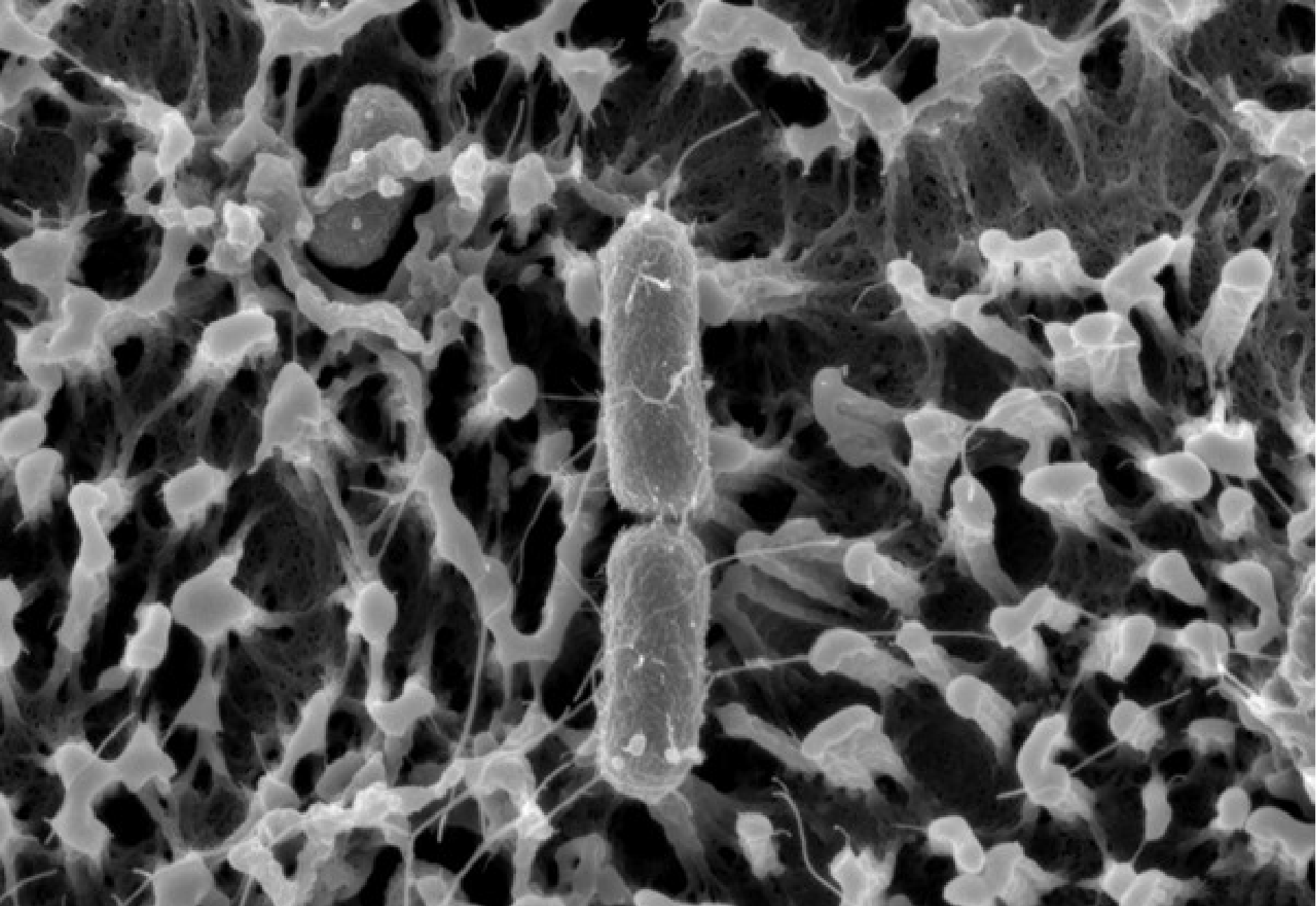 Scanning Electron Microscopy (SEM) image of Salmonella attached to microvilli of a 2Dpolarized intestinal epithelial monolayer. Imaging performed by Nora Trinks in collaboration with Sara Henriksson at Umeå Center for Electron Microscopy (UCEM).