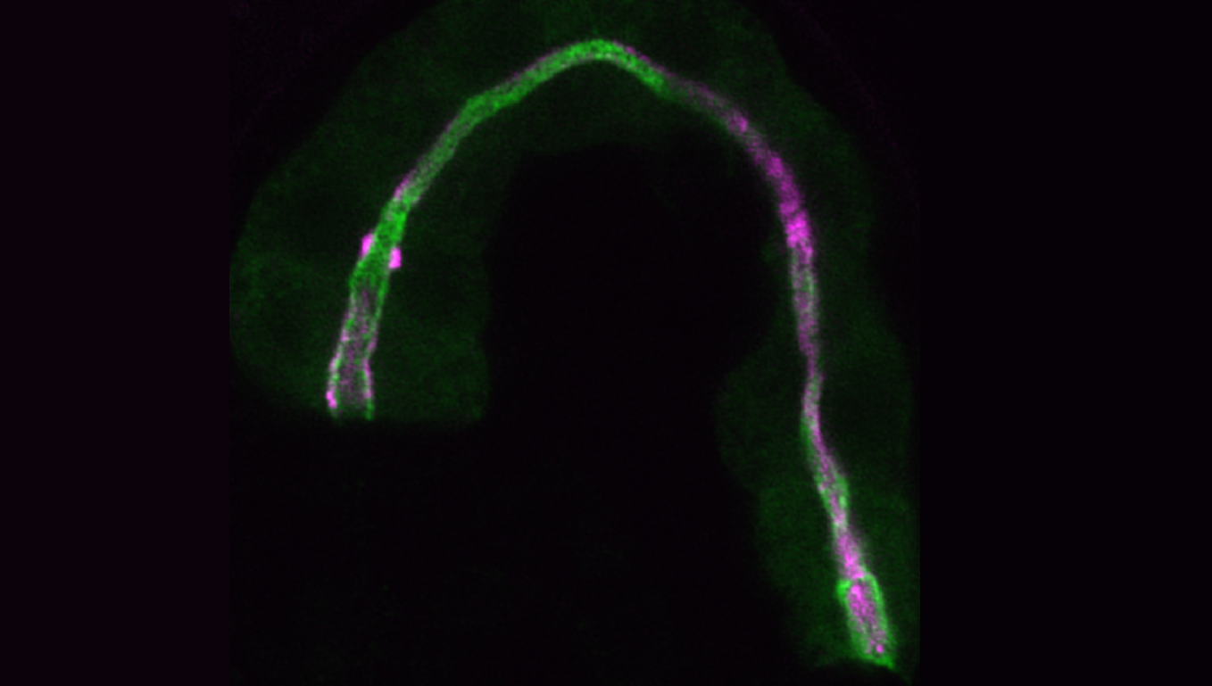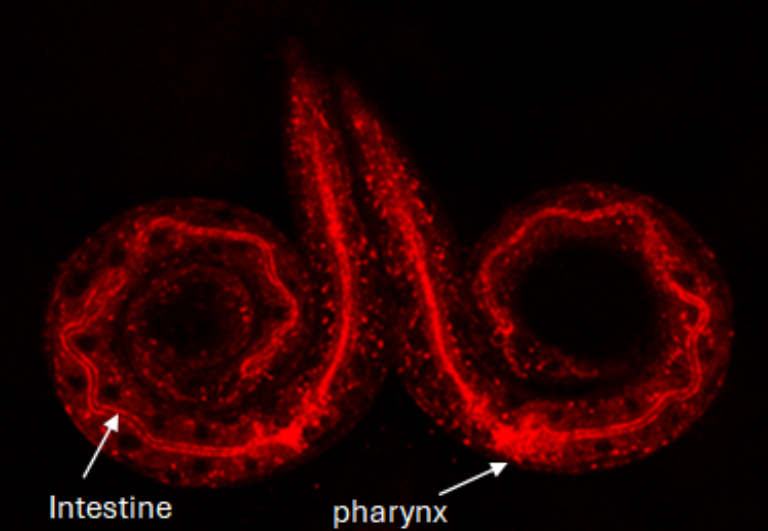 Figure 1. Two worms curled opposite each other showing the expression of the homolog of Myosin 1E (HUM-1, in red) in the intestine and pharynx.